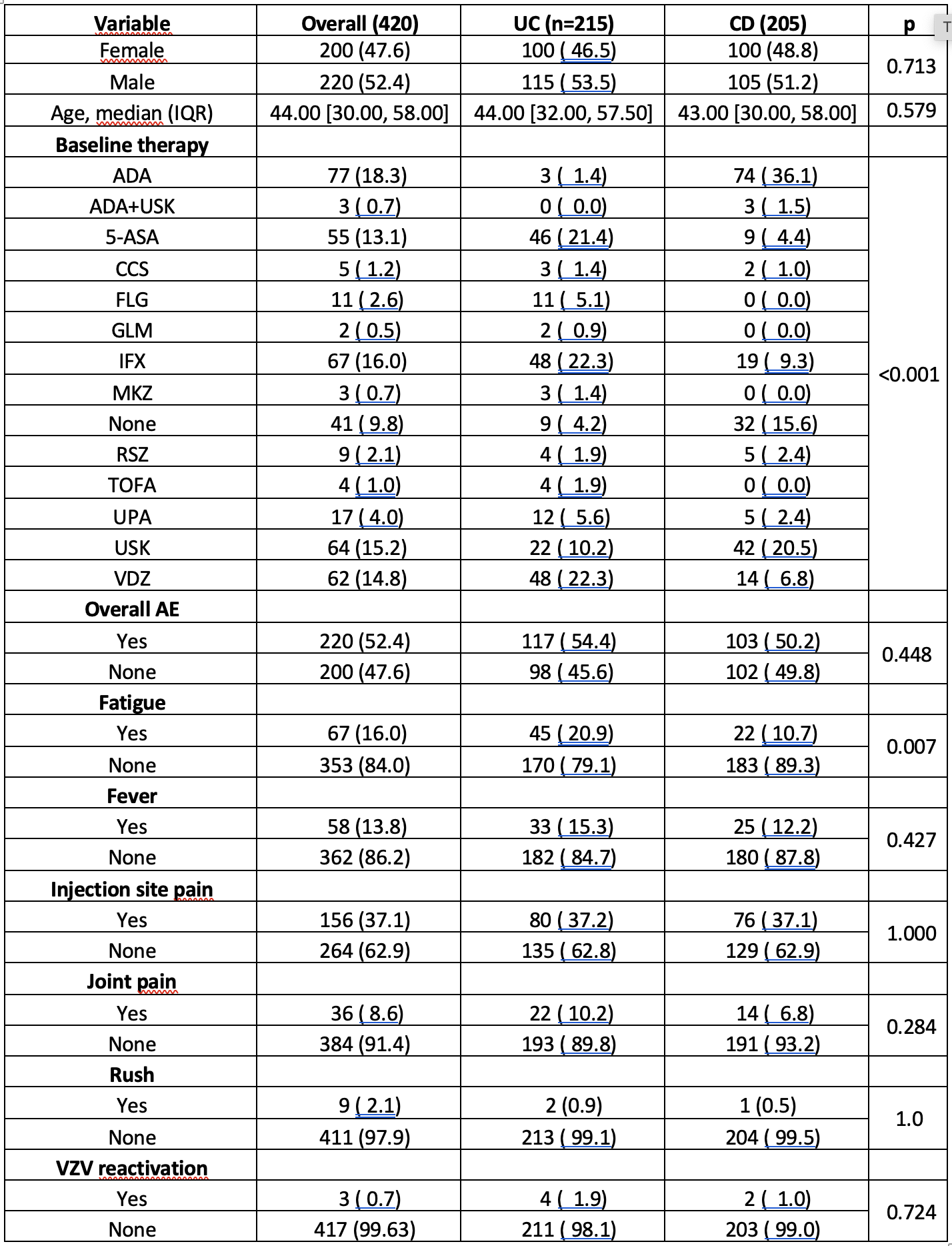 A total of 420 IBD patients were included,comprising 215(51.2%)with UC and 205(48.8%) with CD, with a median age of 44 years(Table 1).Most patients(95.8%)completed the VZV vaccination cycle.Biologic therapy was ongoing in 319(75.9%)patients,more frequently in CDthan UC(p< 0.001).During a mean follow-up of 11.0 ± 1.2 months,VZV reactivation occurred in only 0.7% of patients, confirming a high clinical effectiveness of RZV in IBD.Overall,AEs were reported in 52.4% of cases,with the most common being arm pain(37.1%),followed by asthenia(16.0%)and fever(13.8%).No significant differences between UC andCD(54.4% vs 50.2%,p=0.448),as for gender(p=0.96),were found.AE occurrence was significantly associated with ongoing biologic therapy(56.9% vs 29.3% without,p=0.009)and lower age (median42 vs 45.5years,p=0.047).However,analyzing therapies by specific mechanism of action, including JAKi,no class of drug was associated with a higher AE risk compared to others.Logistic regression confirmed only biologics as an independent risk factor(OR1.84;95%;p=0.009).In the subgroup analysis comparing biologics to conventional or no therapy,only asthenia and joint pain were significantly more common in patients on biologics(p<0.001 and p=0.04, respectively).No serious AEs were reported.
