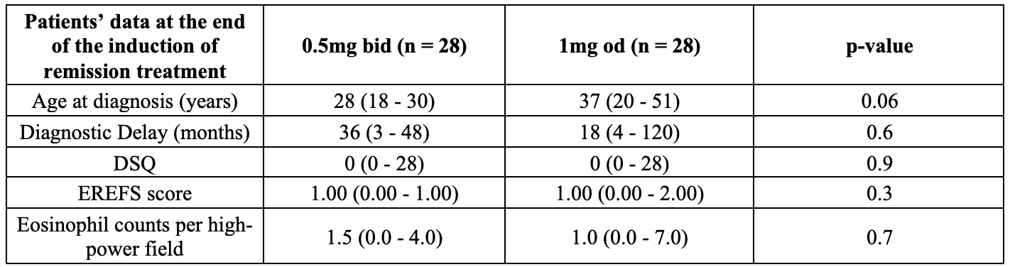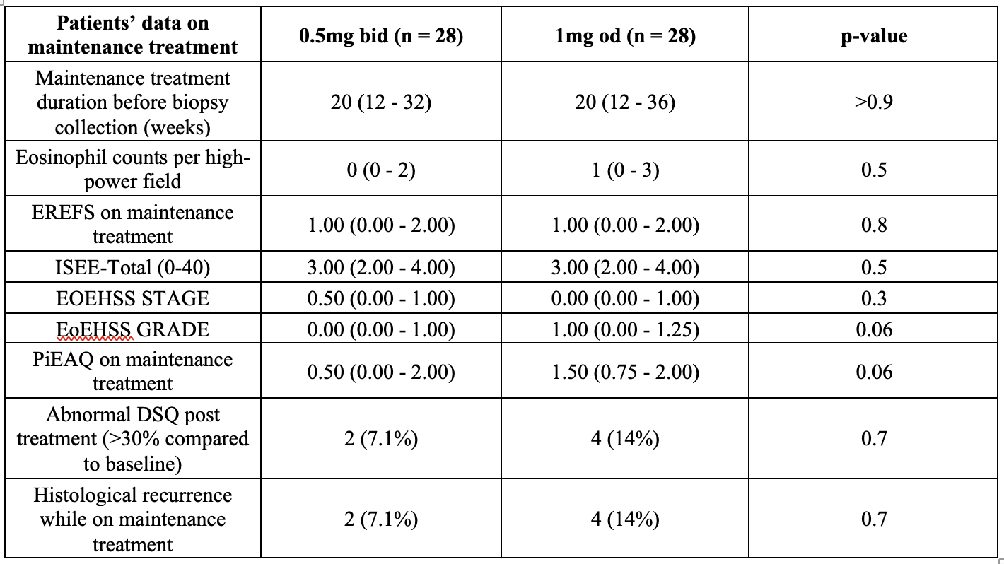 Fifty-six patients were included (46 males and 10 females). Following histological remission with BOT 1mg bid, 28 (50%) initiated maintenance treatment with BOT 1mg od and 28 (50%) with BOT 0.5 bid. At the end of induction of remission (T0), the two groups had achieved similar outcomes, with comparable median DSQ [0 (0-28) vs 0 (0-28)], EREFS [1 (0-2) vs 1 (0-1)], and PEC [1 (0-7) vs 1.5 (0-4)] (all p>0.3) (Table 1). At the end of the maintenance treatment (T1), the two groups had been taking maintenance treatment for a comparable duration [20 weeks (12 – 36) vs 20 weeks (12 – 32; p=0.7). Persistent histological and clinical remission at T1 was present in 86% of BOT 1mg od versus 93% of BOT 0.5 bid (p=0.7). In addition, EREFS scores were comparable between groups at T1 [1 (0-2) vs 1 (0-2), p=0.8]. Similarly, the EoEHSS stage and grade was comparable between groups, as was the PiEAQ score [1.5 (0.75-2) vs 0.5 (0-2); p=0.06], and the I-SEE score [ 3 (2-4) vs 3 (2-4); p=0.5] (Table 2).